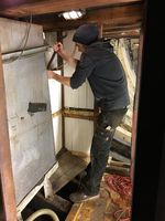 Während ich die alten Spanten rausgekloppt habe, und danach den Holzabfall aus der Halle gefahren hab, wurden an 3 weiteren neuen Spanten gearbeitet. Für den Spant unterm Salonschott musste das untere Drittel vom Schott weichen. Der Tisch ist noch drin im Salon, aber abgestützt.