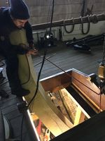Zwei neue Spanten durfte ich heute mit dem Kran an Bord holen. Nach dem Zuschnitt und Hobeln nach der vorgefertigten Schablone werden die neuen Spanten an den Kran gebundenen, hochgefahren und durch das Skylight ins Vorschiff gebracht.