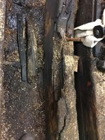 Die nächsten Spanten sind sichtbar. Besonders schlecht sehen die Spanten in der zweiten Reihe nach dem Schott aus. Unter dem Stahl hat sich das Holz völlig aufgeweicht. Bester Lebensraum für Werftbohrkäfer, von dem wir auch eine Larve in der „Blumenerde“ gefunden haben.