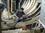 Moin, zuerst die Preisfrage des Tages, wer hat unsere Kombüse zerlegt an Deck stehend erkannt ? Der Tag bekommt eine gewisse Routine, den Leuten helfen, wo es angebracht ist, Holzmüll entsorgen, Jan hat Ersatz für unsere kaputt gegangenen Mastkeile geschnitten. Ich habe am Ballast und Maschinenschott rumgewerkelt. Heute wurde viel Krummholz für die Spanten verarbeitet, siehe Fotos, und unser Salon ist fast nicht mehr begehbar, weil dort die Wassertanks stehen. Man kann sich kaum vorstellen, dass irgendwann alles wieder an seinem Platz sein soll. Mittags stand Andreas vom Kran plötzlich auf der Werft, mal kucken, sagt er. Wir haben dann zusammen gegessen und dann Schiff und Werft besichtigt. Jetzt ist Abenbrot drann und dann beim Spaziergang mit Amy vielleicht eine Kneipe ansteuern.